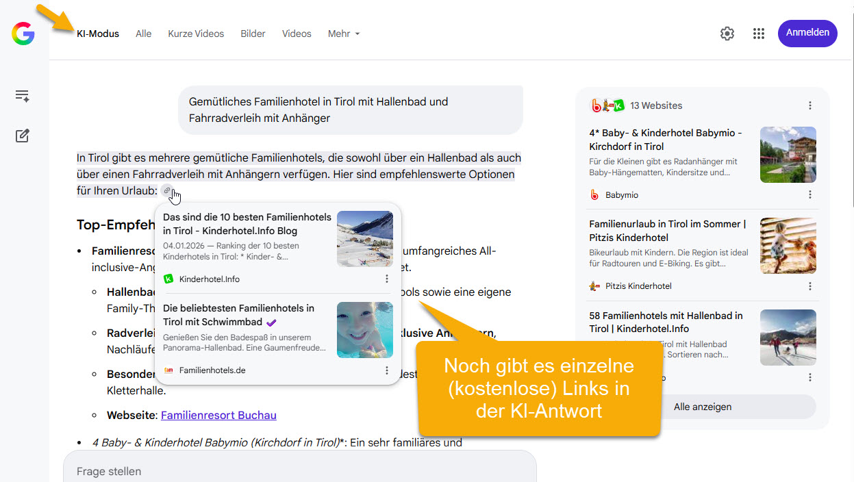 Google KI-Modus Antwort auf die Frage nach Familienhotel in Tirol mit Fahrradverleih. Quelle: eCoach.at, Screenshot 18.04.2026