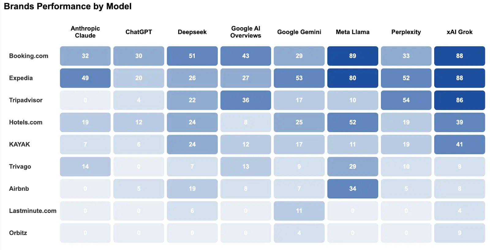 Welche Reisewebseite wird von welchem KI-Antwort-System für einen definierten Satz an Fragen zitiert? Quelle: Meltwater https://www.meltwater.com/en/blog/online-travel-platform-ai-visibility-index