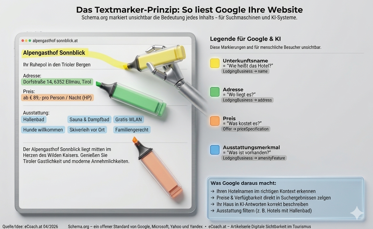 Das Textmarker-Prinzip: So funktioniert Schema.org für Hotels, Quelle: eCoach.at, 04/2026
