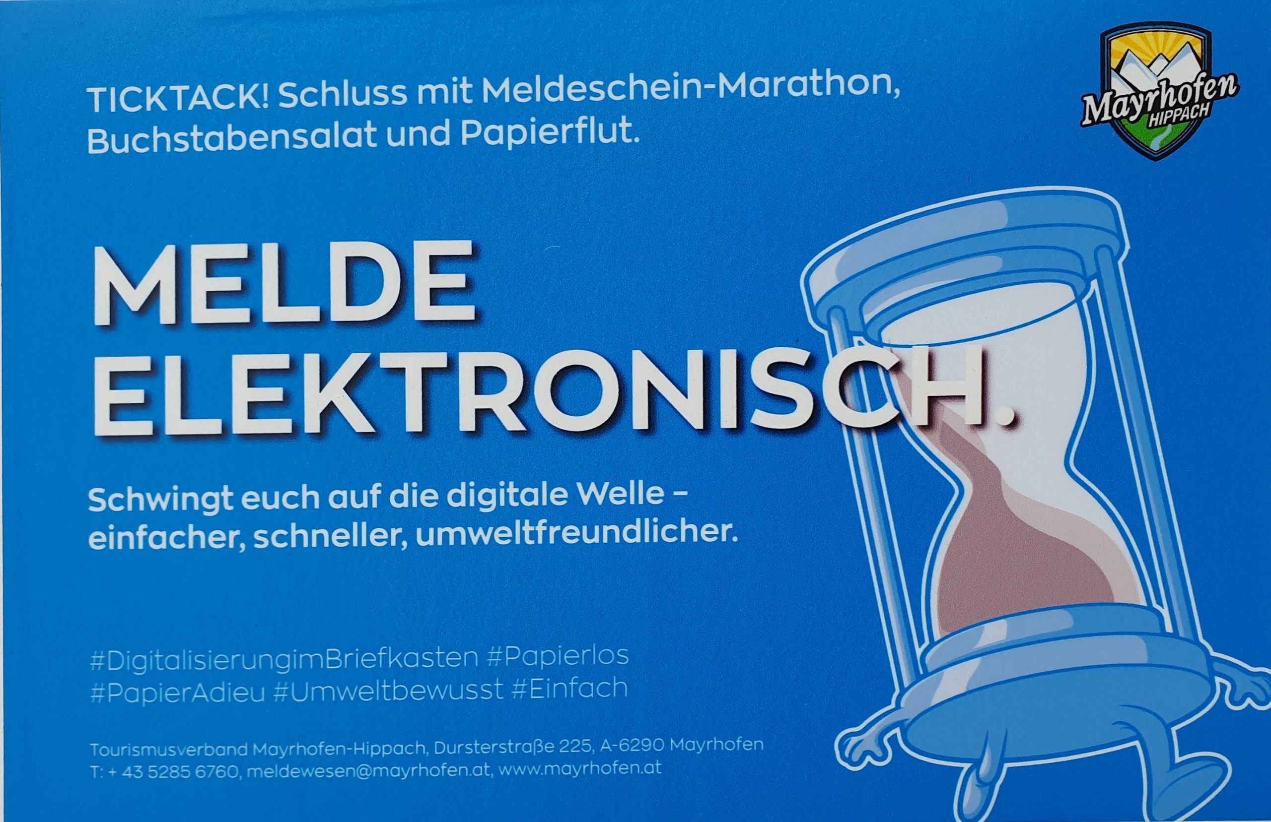 Die Vorteile der elektronischen Meldung lassen sich auch gut kommunizieren. Hier ein Beispiel vom TVB Mayrhofen-Hippach: Mit dem Poster „Melde elektronisch“ wirbt er für die Vorteile digitaler Gästemeldung – weniger Papier, schneller, einfacher und umweltfreundlicher.